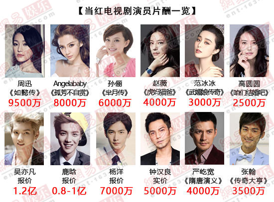 此外,孙俪2015年出演《芈月传》(81集)的片酬也达到6000万,这是经过“限薪令”后,孙俪片酬从85万一集减到50万一集之后的总体价格;赵薇2014年的《虎妈猫爸》(45集)片酬达3000万,而同年范冰冰的《武媚娘传奇》(96集)片酬也是80—90万一集,总片酬3000万;高圆圆2013年则凭《咱们结婚吧》收获2500万片酬,30到50万一集。